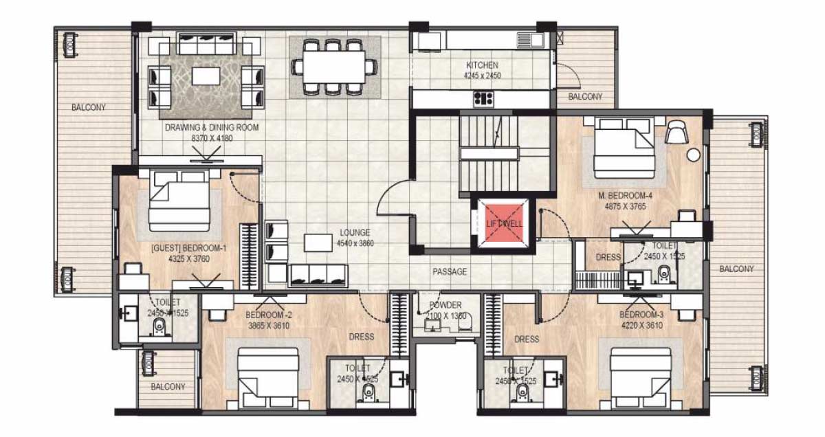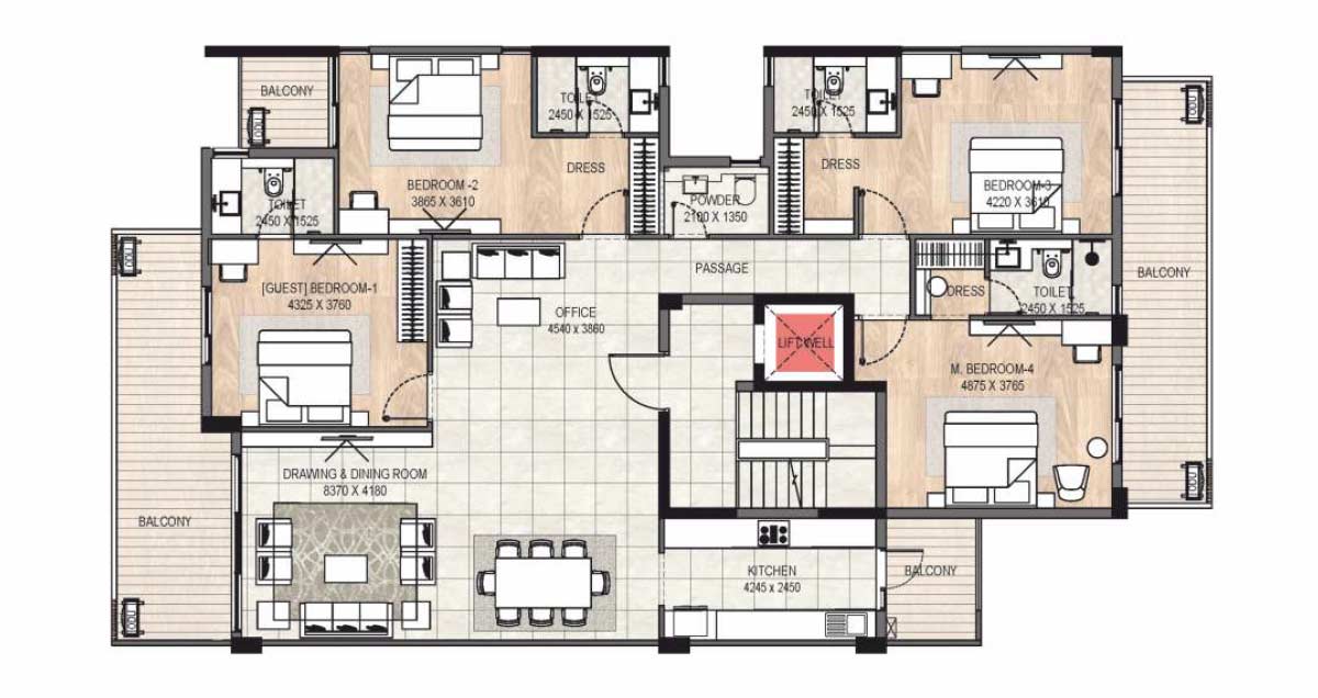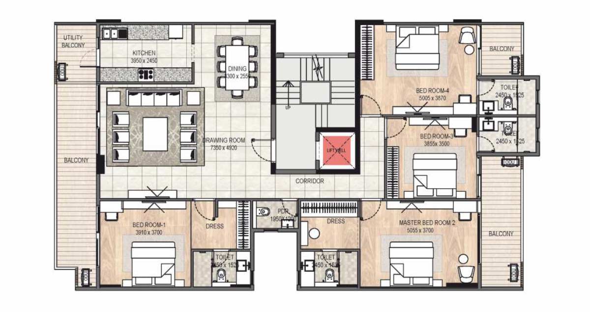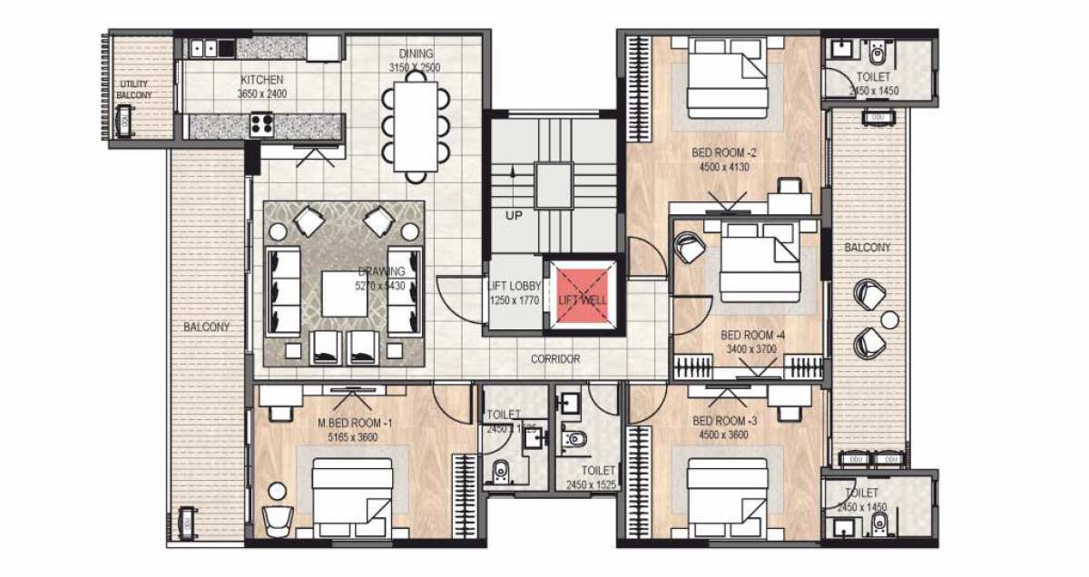 The units are efficiently planned to carve out the maximum usable area. Each room is designed to ensure a bright ambience with seamless air circulation. Covered car parking at the stilt level entrance, with an elevator and staircase lobby equipped with CCTV cameras, provide a secure and comfortable experience.