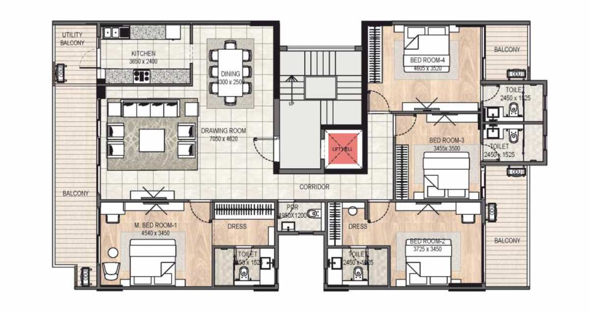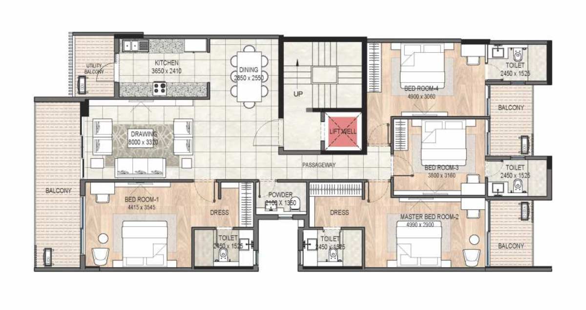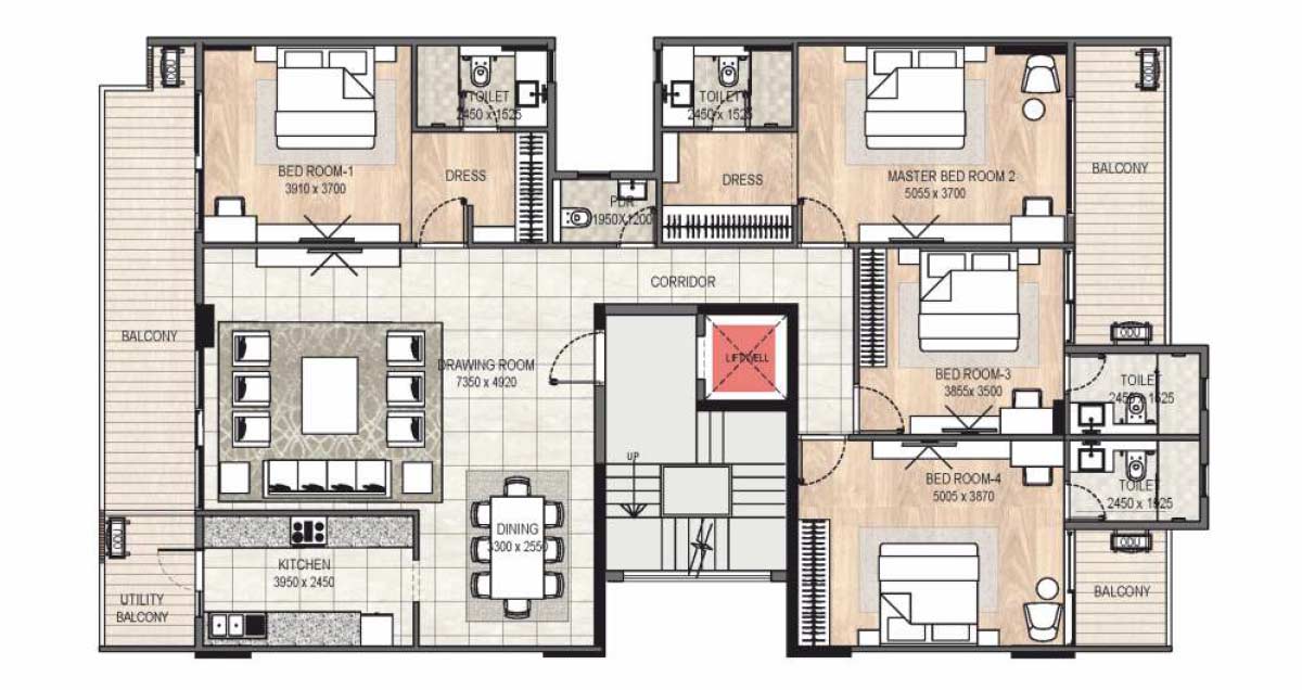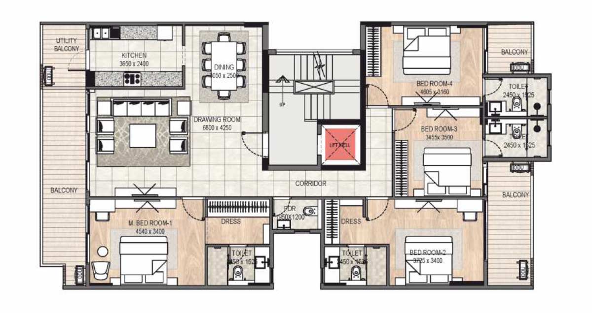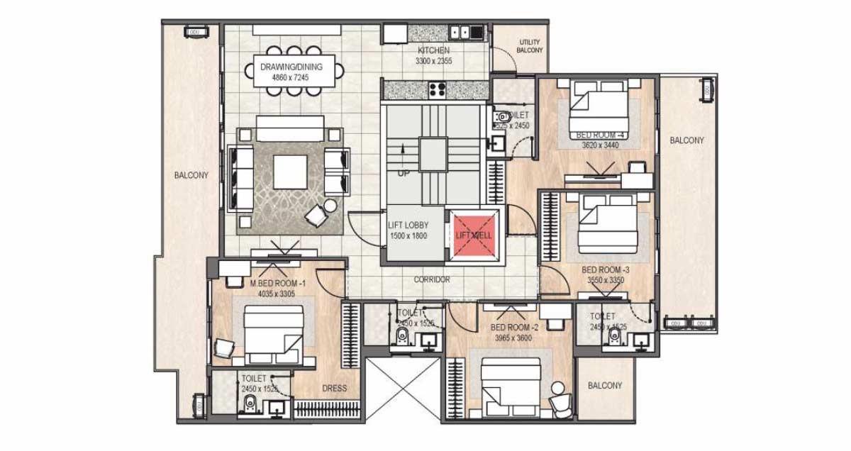 The units are efficiently planned to carve out the maximum usable area. Each room is designed to ensure a bright ambience with seamless air circulation. Covered car parking at the stilt level entrance, with an elevator and staircase lobby equipped with CCTV cameras, provide a secure and comfortable experience.