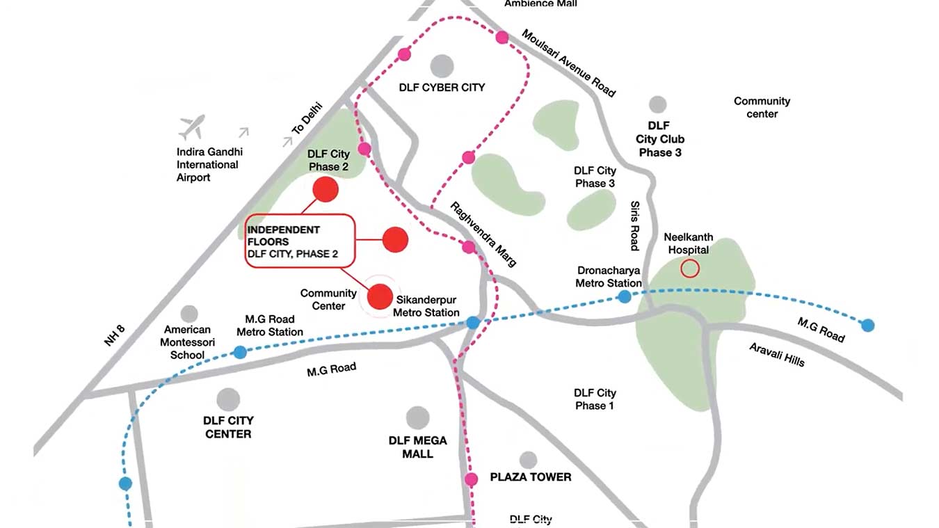 DLF City Phase II is surrounded on three sides by the express lifelines of Gurugram: Delhi-Jaipur Expressway (NH-48), Mehrauli-Gurugram Road and Raghvendra Marg. The internal arterial roads Jacaranda Marg, Akashneem Marg, Dakshin Marg and Bougainvillea Marg, with a network of supporting roads, seamlessly connect to these expressways. Metro stations at MG Road, Sikanderpur and DLF City Phase II on three sides and DLF Cybercity in close proximity make the location ideal for corporate honchos and business owners. Retail destinations with premier socialising zones at DLF Cyber Hub and MG Road are only a short drive away.