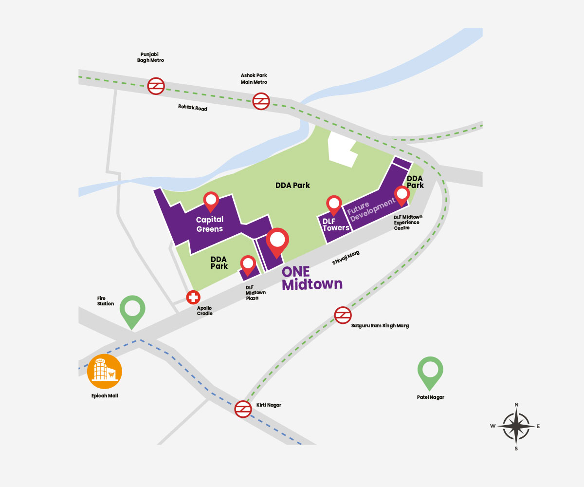 DLF One Midtown is strategically located in Shivaji Marg, Moti Nagar, West Delhi. This prime spot offers excellent connectivity within Delhi and to other NCR regions.