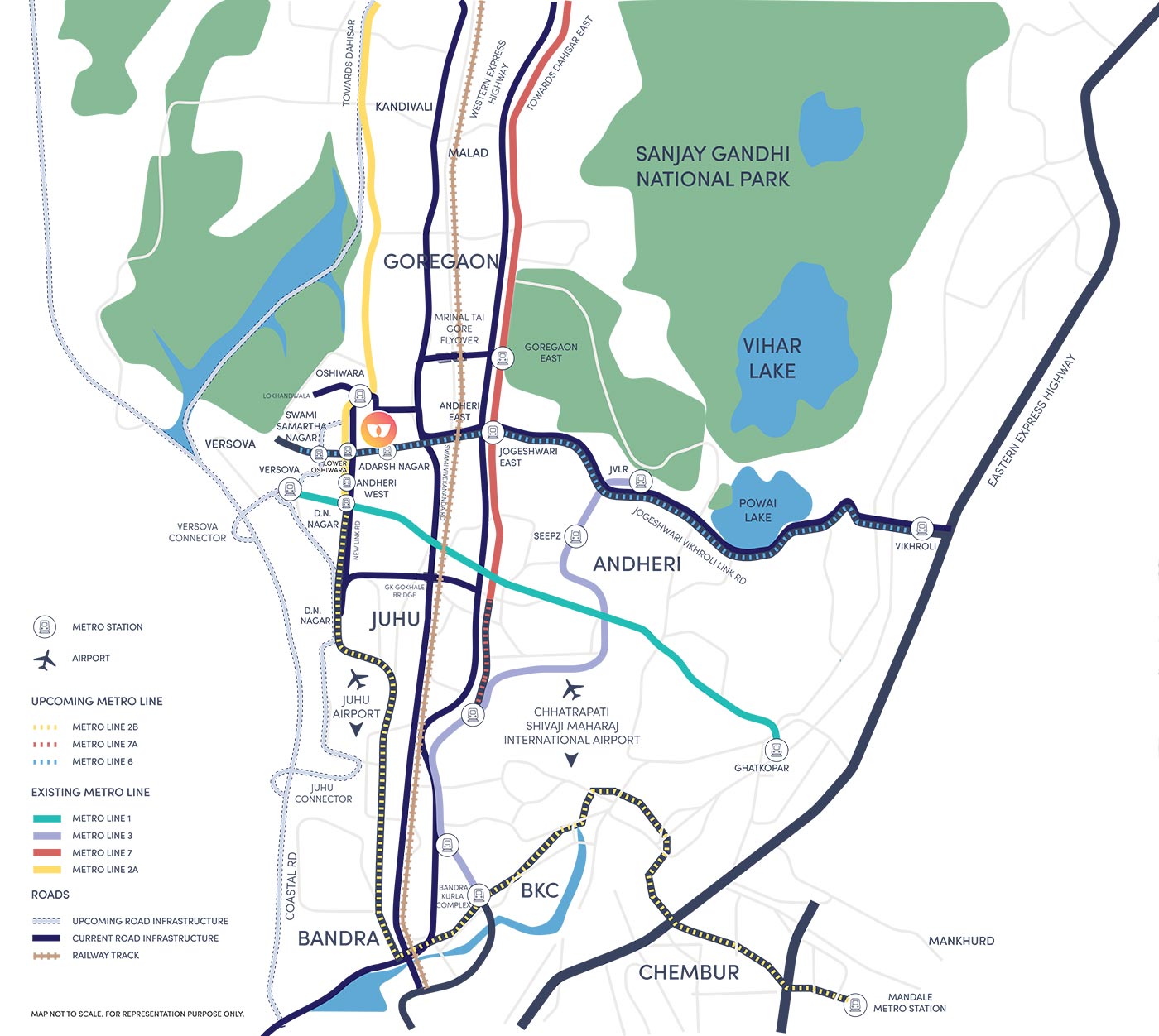 Strategically situated in Andheri West, near Lotus Petrol Pump and directly opposite Infiniti Mall. It boasts excellent connectivity to major arterial roads (Link Road, Western/Eastern Motorways), metro stations, and both international and domestic airports.